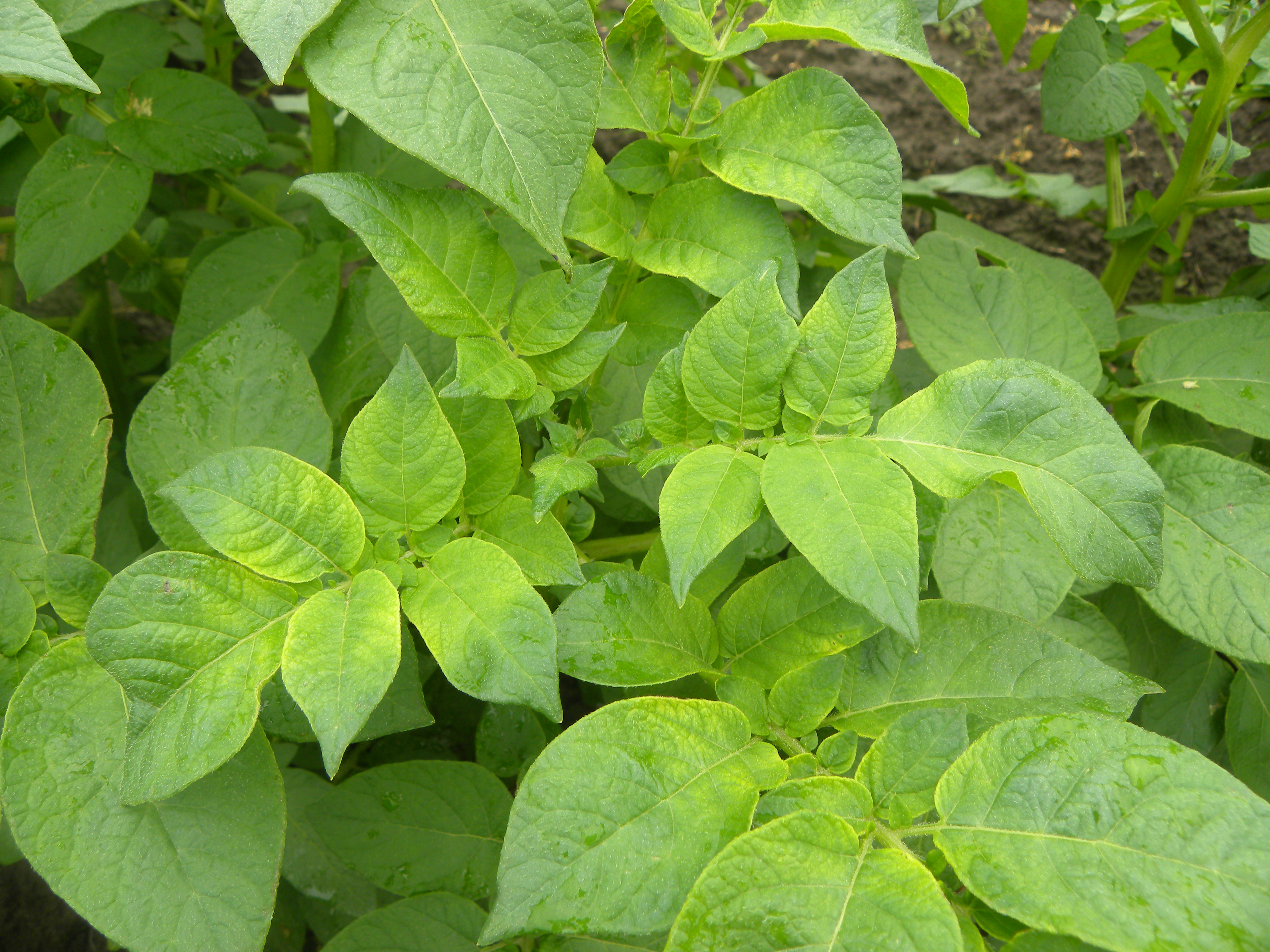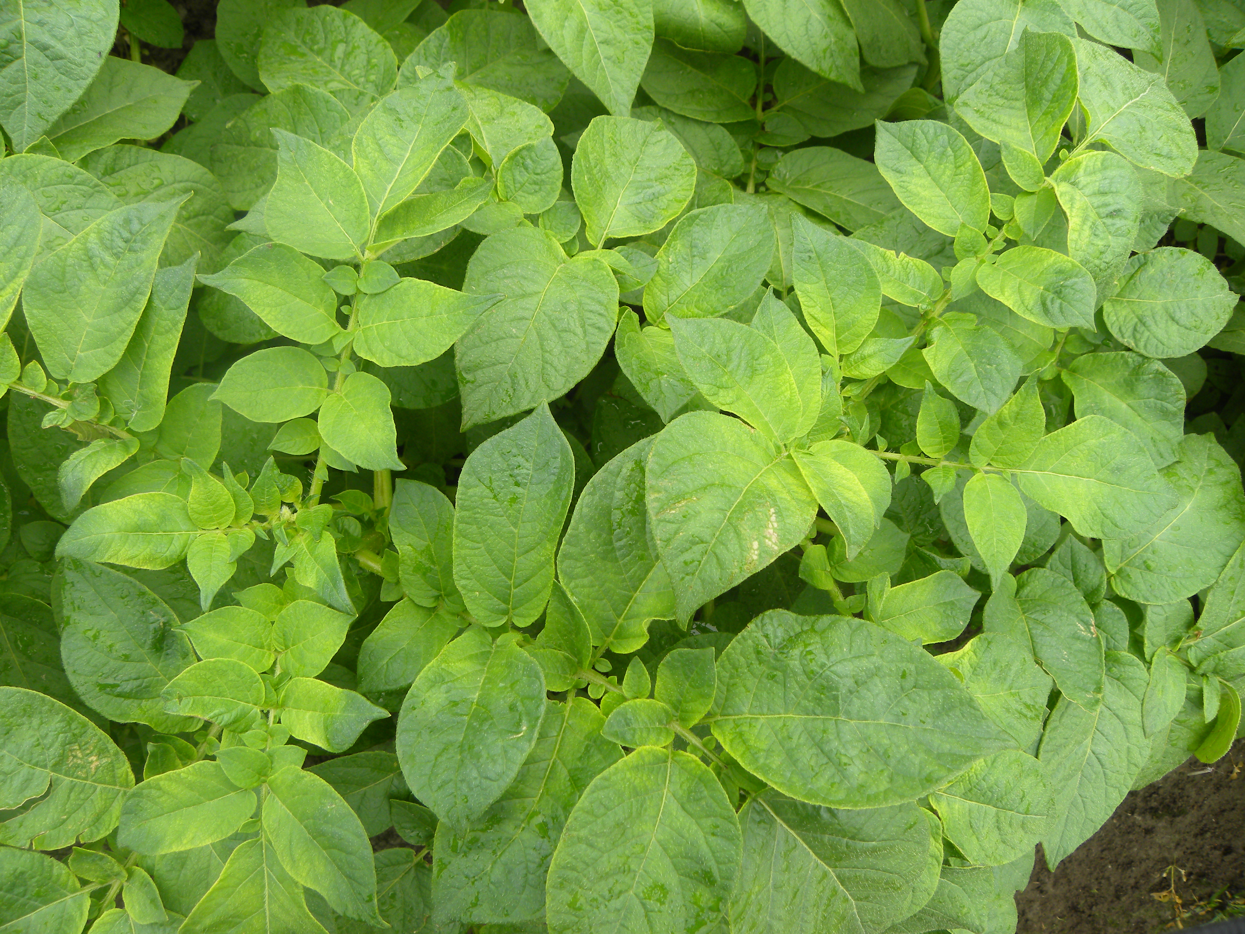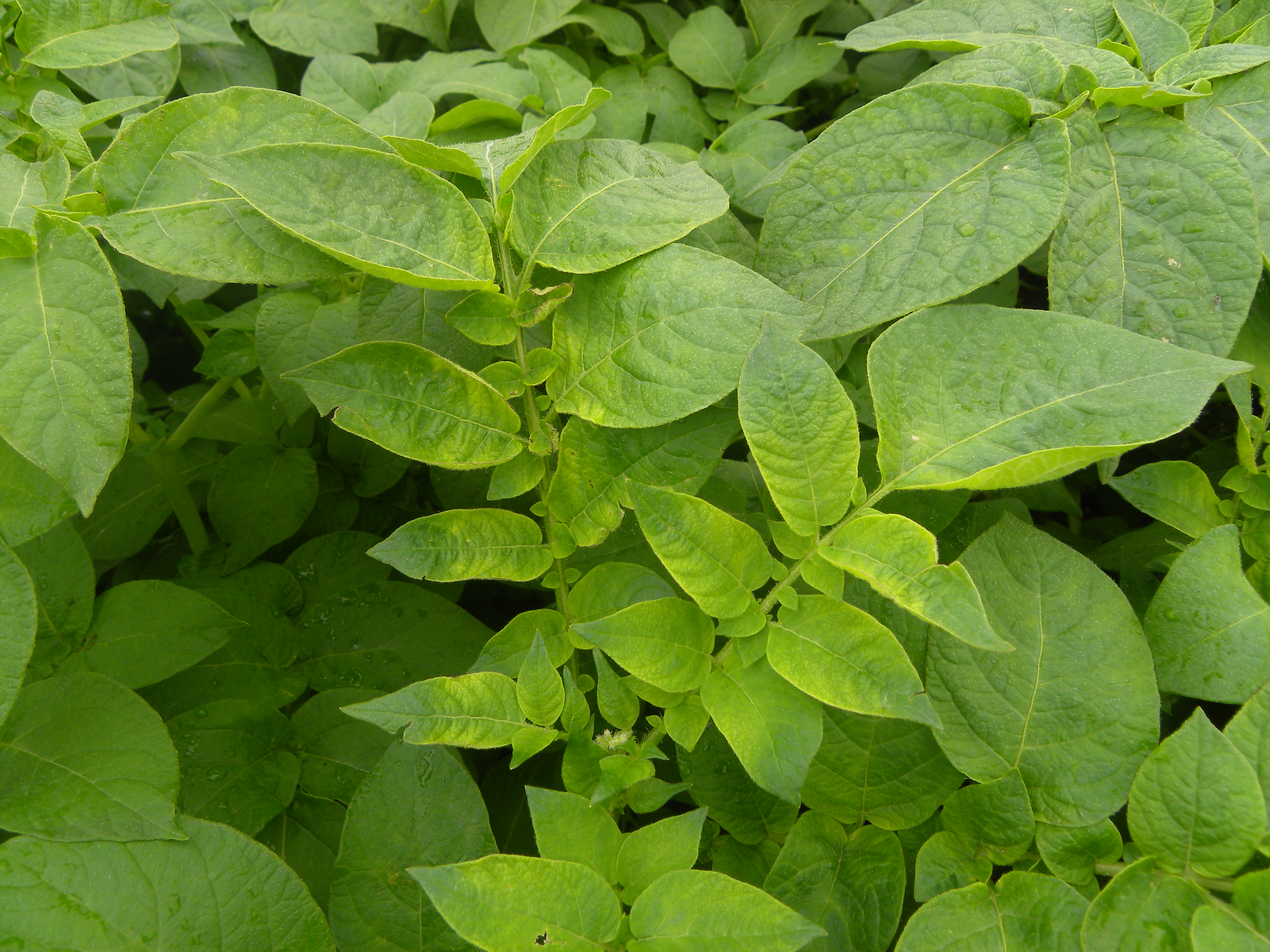 Märkyydestä kärsinyt kasvusto, jossa lehdet ovat alkavat vaalenemaan lehtihangasta lähtien. Jossain lehdyköissä vaaleneminen ei ole vielä edennyt kärkiin saakka. Juhani Rahko