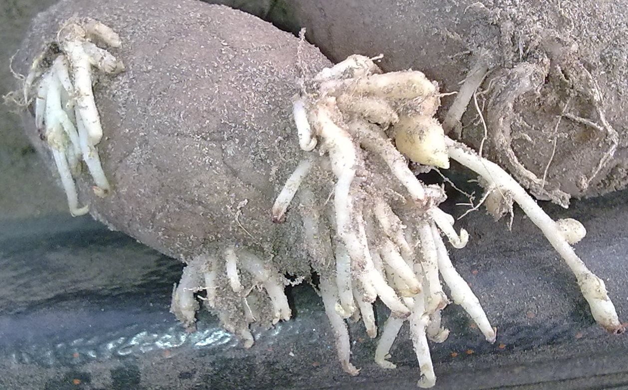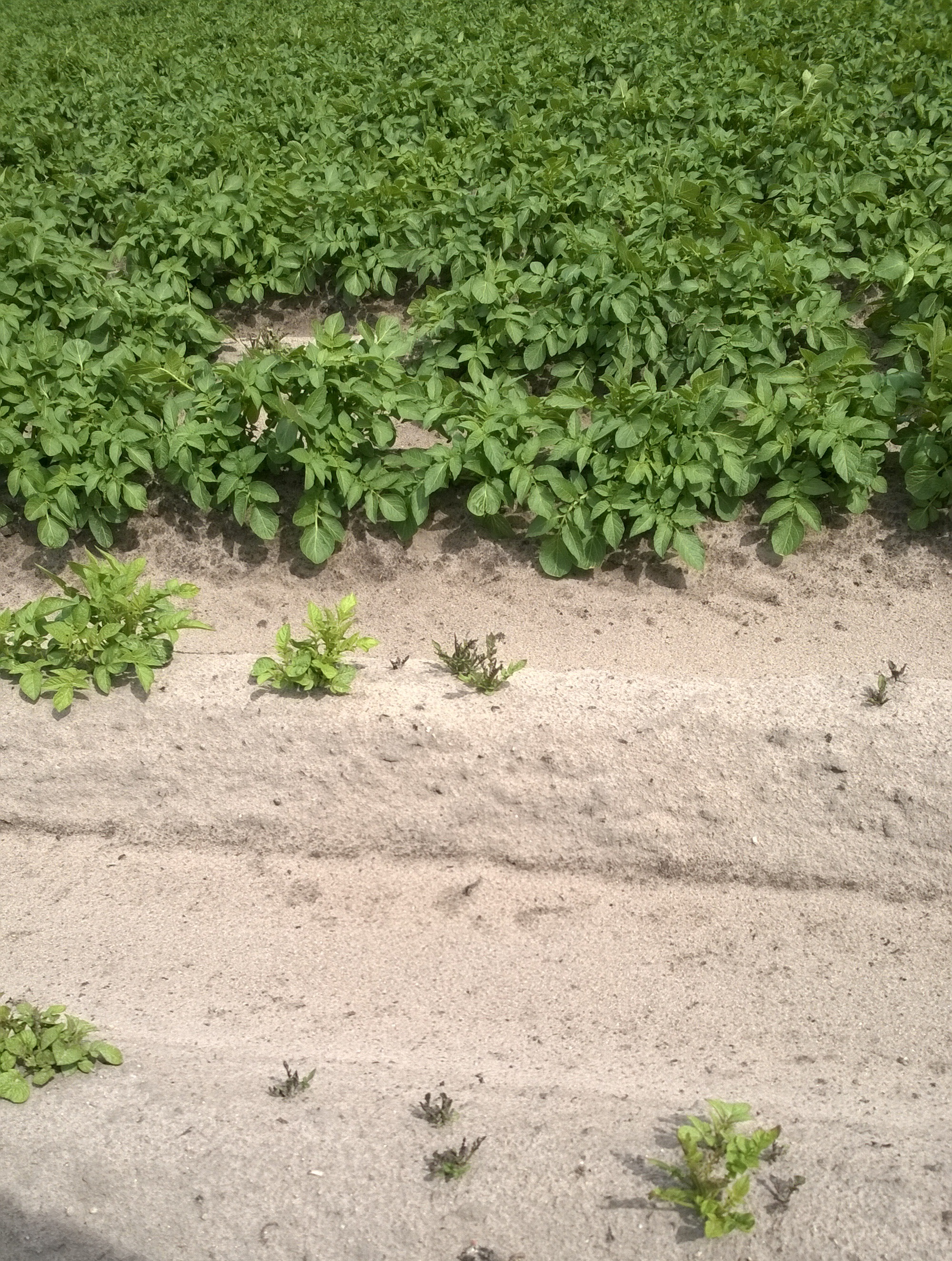 Klopyralidia ja pikloraamia sisältävän Galeran maajäämästä kärsineen perunan satoa istutettiin puhtaaseen maahan. Oireita ilmeni vain taimivaiheessa. Vasemmalla on puhtaasta siemenestä kasvanut taimisto. Keskellä lievästi oireileva, joka toipui ja tuotti normaalin sadon. Oikealla voimakas kasvuhäiriö, joka aiheutti 40 % satotappion. Anne Rahkonen