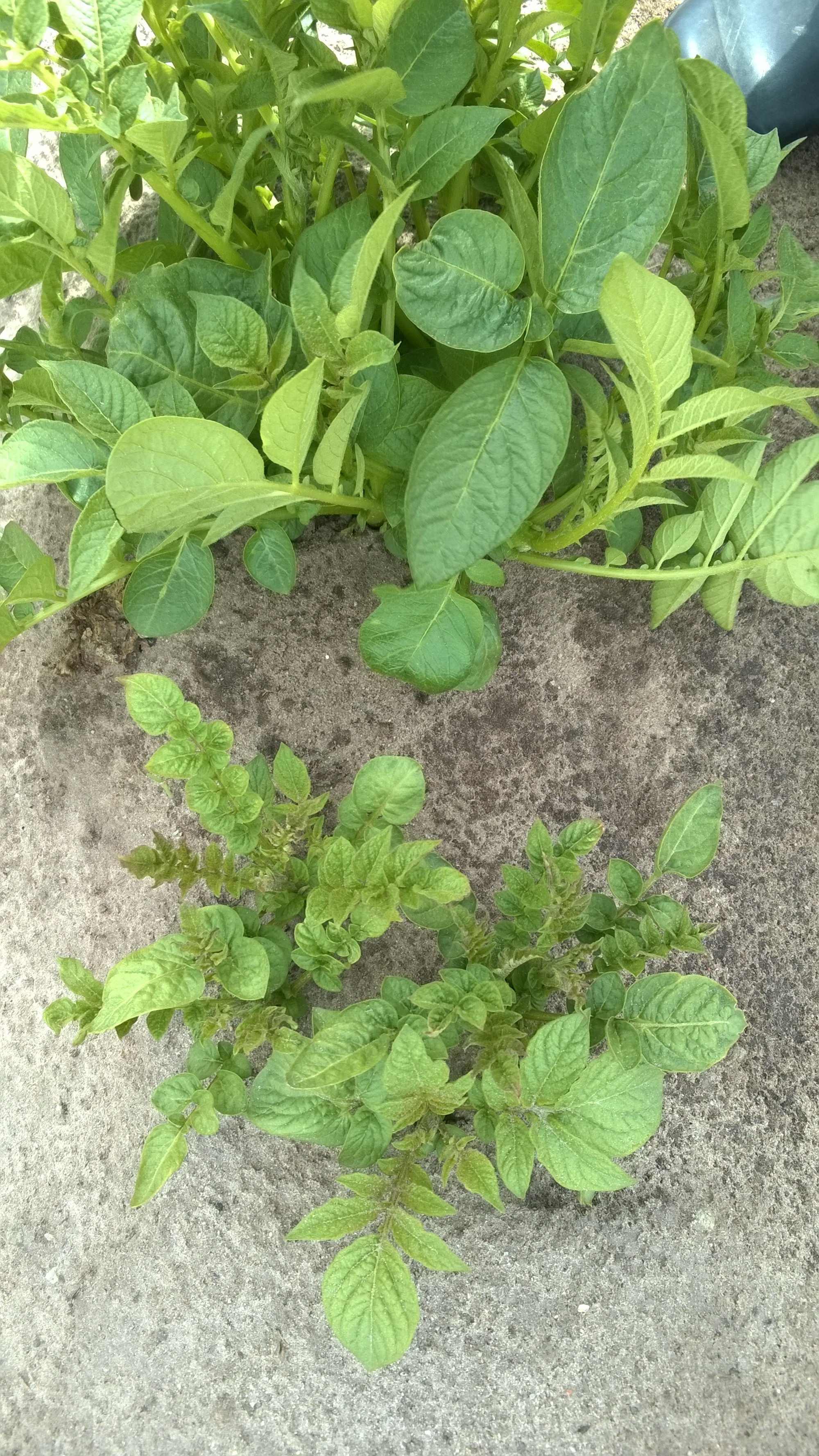 Siemenperäisen glyfosaattijäämän aiheuttamaa kurttuisuutta ja epämuotoisuutta perunanlehdissä. Siemenperäisen glyfosaattijäämän aiheuttamaa kurttuisuutta ja epämuotoisuutta perunanlehdissä. Vieressä normaalisti kehittynyt taimi. Anne Rahkonen